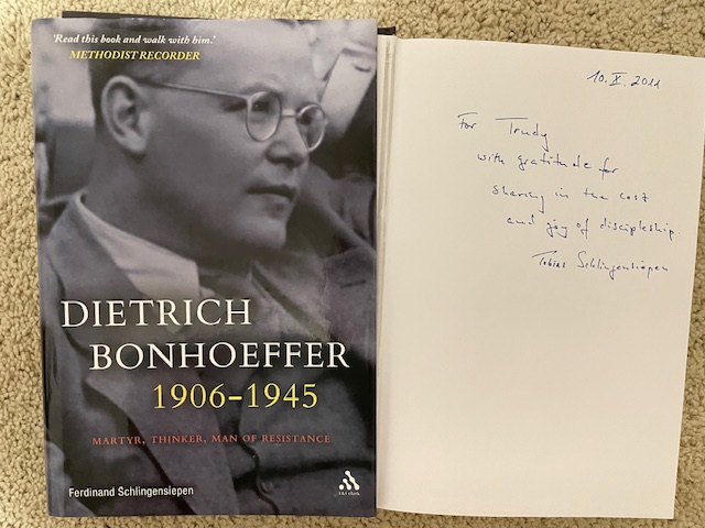 I spent much of the last year reading through Ferdinand Schlingensiepen’s comprehensive biography of Dietrich Bonhoeffer, subtitled Martyr, Thinker, Man of Resistance. The biography has been out for about 15 years now … and my copy was a gift from a colleague, Tobias Schlingensiepen, the author’s nephew, less than a year after publication. If their surname itself isn’t a tell, Tobias’s dating on his inscription in my copy was done auf Deutsch. From our many conversations as we worked together, I knew Tobias still has close contact with much of his family in Germany … that members of his family had also been involved in the resistance movement during the Nazi era … that Eberhard Bethge (Bonhoeffer’s closest friend) was a long-time family friend … and that relatives back in that era had connections with the Bonhoeffer family. Tobias, Ferdinand, and their family know who and what they are talking about.
